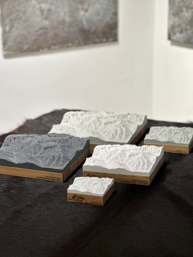 Detailgetreue 3D Modelle aus nachhaltigem Bio-Polymer (PLA) gedruckt und auf hochwertigem, geöltem, 26mm starkem Eichenholz präsentiert. Die Daten der Reliefs basieren auf hochpräzisen LiDAR und SRTM Daten.
